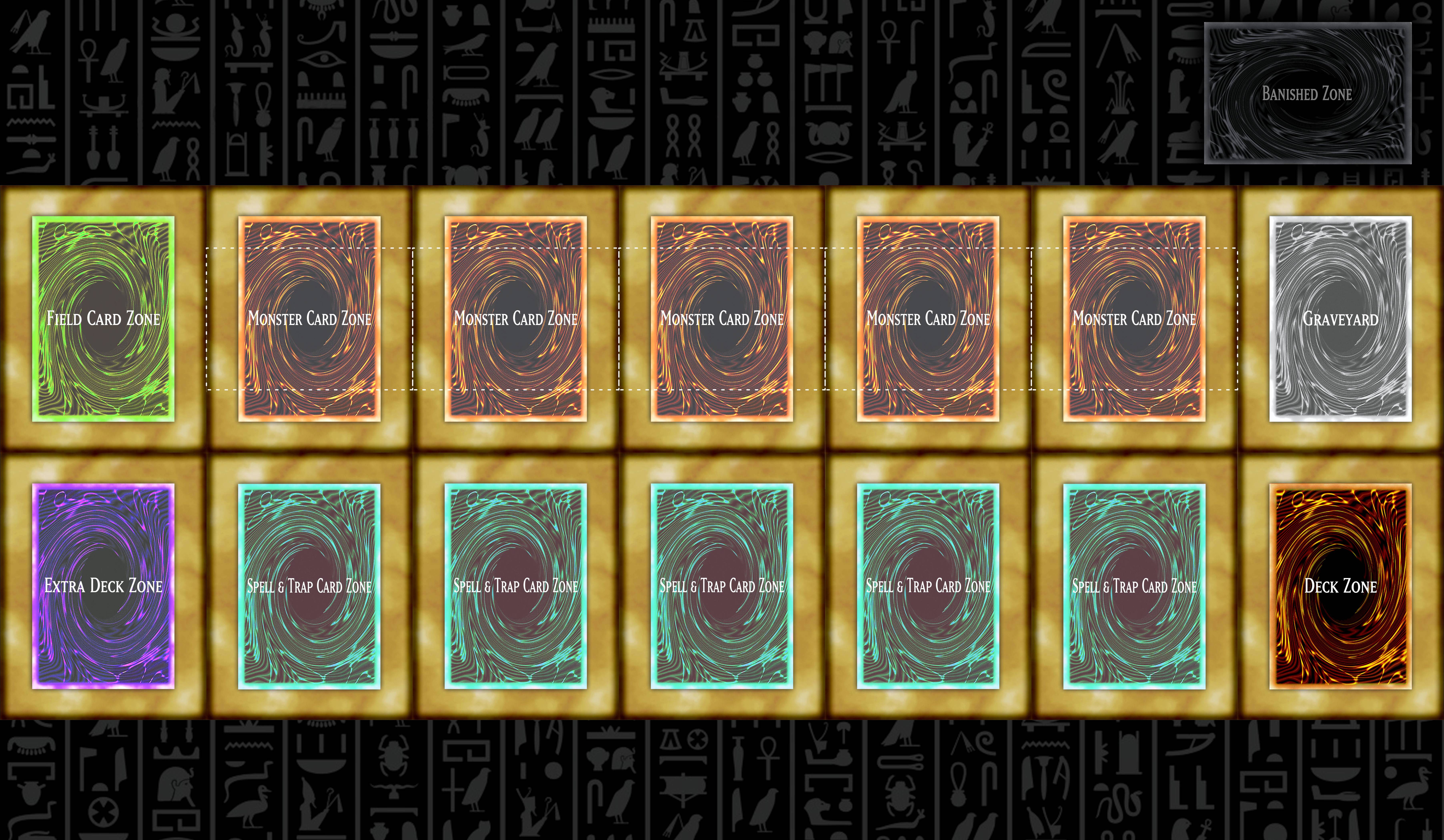 Each side of the field consists of two rows of 5 zones on top of each other; the one closer to your opponent contains the creature zones, and the one closer to you has the artifact zones (very similar to a Yu-Gi-Oh! board). There is also an 11th, separated Monument zone for each player, that is on the field but not considered adjacent to anything, and thus cannot be targeted or target anything via arrows. Monuments do not interact with the targeting system.